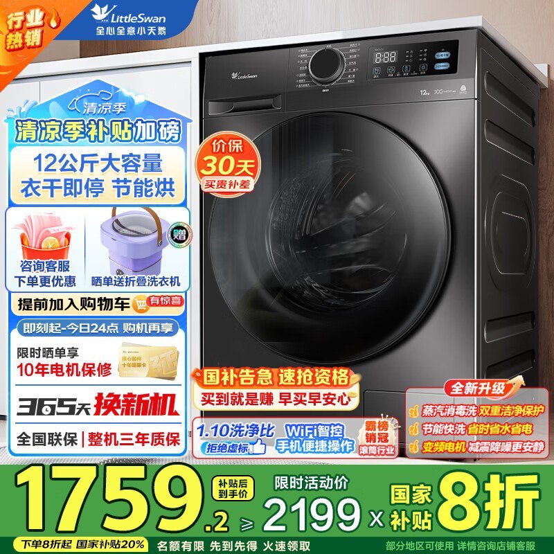 小天鹅滚筒洗衣机TD12V20促销:高效洁净除菌螨,变频节能仅1660元