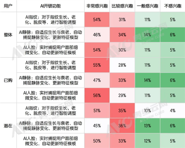 在开锁功能方面,“AI指纹”与“AI人脸识别”并列第二,均获54%用户青睐。这类功能通过智能适配指纹老化、面部变化等问题,解决了传统生物识别的痛点。