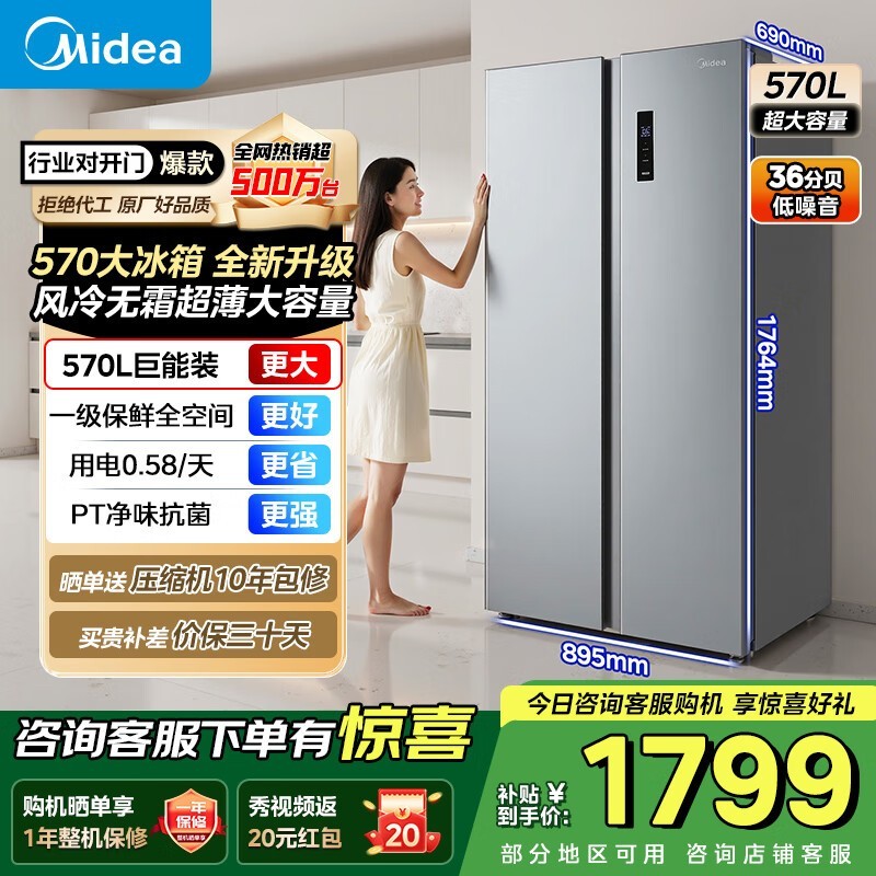 美的570L对开冰箱一级变频静音节能智能净味风冷无霜