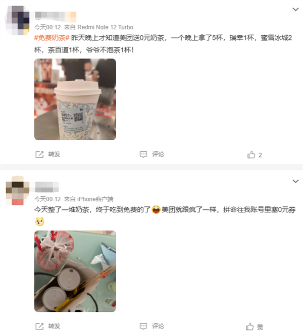 有网友表示:“星期六的0元外卖吃不完喝不完,领了几十杯喝的,还有各种吃的,美团真的疯了。”