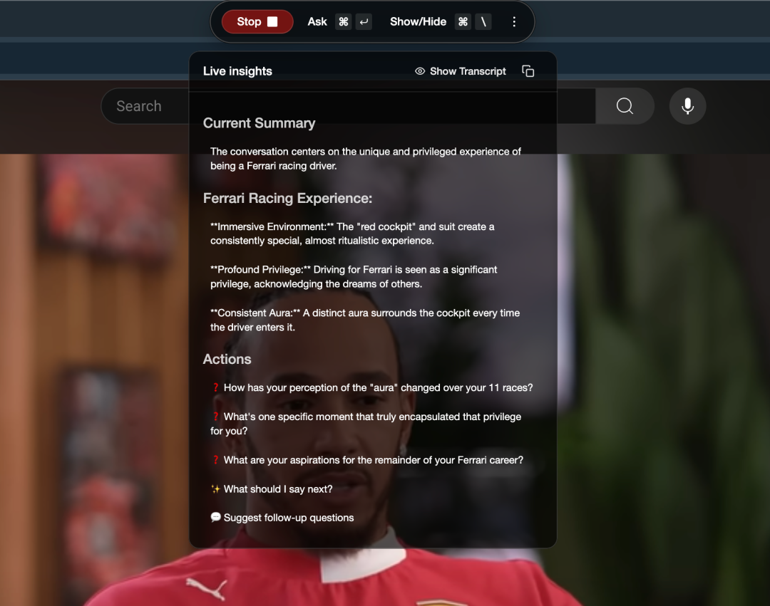 除了老生常谈的会议记录功能,Glass 的应用场景还能体现在看视频上:我在 Glass 开启的状态下,打开一个主题是关于 F1 车手刘易斯-汉密尔顿的采访视频。在不到三分钟之后,Glass 就通过目前读取到的内容,帮我生成了一份当前内容摘要。