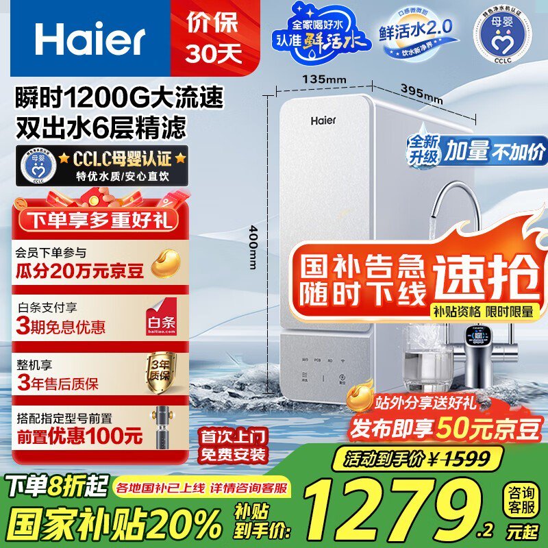 海尔鲜活水净水器1000G大通量RO反渗透家用直饮HKC2400-R887D2U1