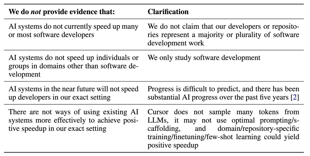 过程中,METR 排除了许多实验干扰因素,比如开发者使用了前沿模型、遵守了处理分配规则、没有选择性地放弃问题(例如放弃困难的不使用 AI 任务从而降低不使用 AI 组的平均难度),并且在使用和不使用 AI 的情况下都提交了质量相近的 PR(Pull Request)。