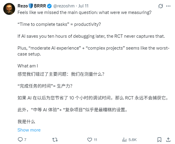 有人则对 METR 的测量指标产生了质疑,表示「完成任务的时间」不能与「生产力」划等号,并且中等 AI 经验与复杂项目测试同样是糟糕的设置。