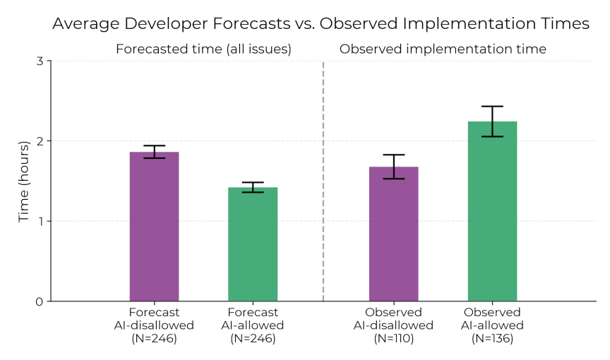 下文展示了开发者预测的平均时间和实际观察到的实现时间。我们可以清晰地看到,当开发者被允许使用 AI 工具时,他们花费的时间明显更长。