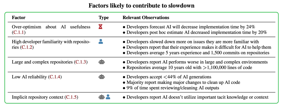 为了更好地理解这些因素,METR 考察了实验环境中的 20 项属性,发现其中有 5 项很可能是造成开发速度放缓的原因,另外有 8 项则表现出混合或不明确的影响。