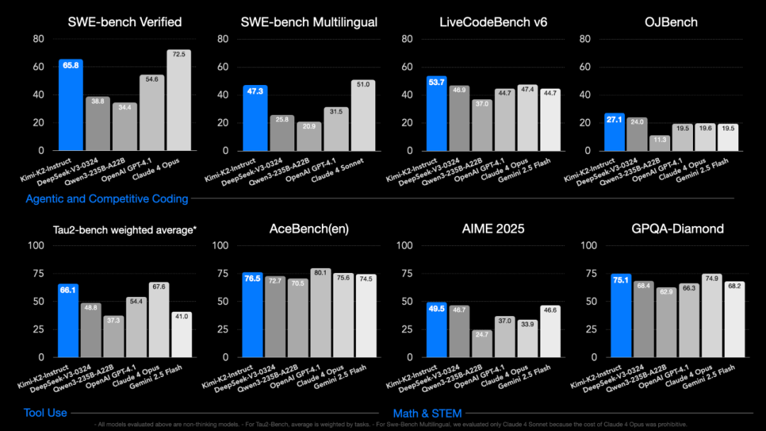 Kimi K2 在自主编程(Agentic Coding)、工具调用(Tool Use)和数学推理(Math & Reasoning)三大能力维度的基准性能测试中取得优秀表现。