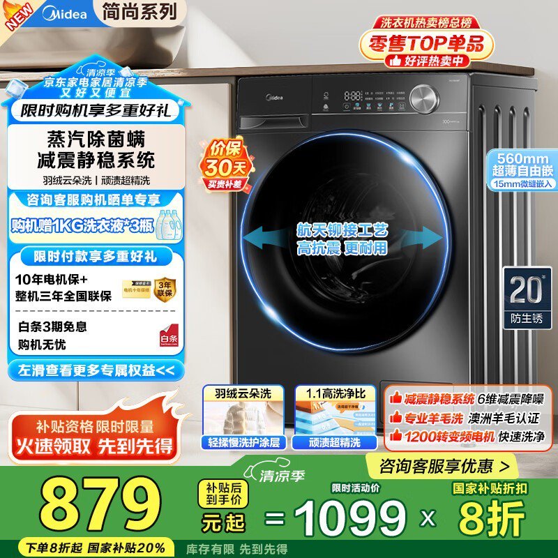 美的滚筒洗衣机MG100V36T限时特惠879元