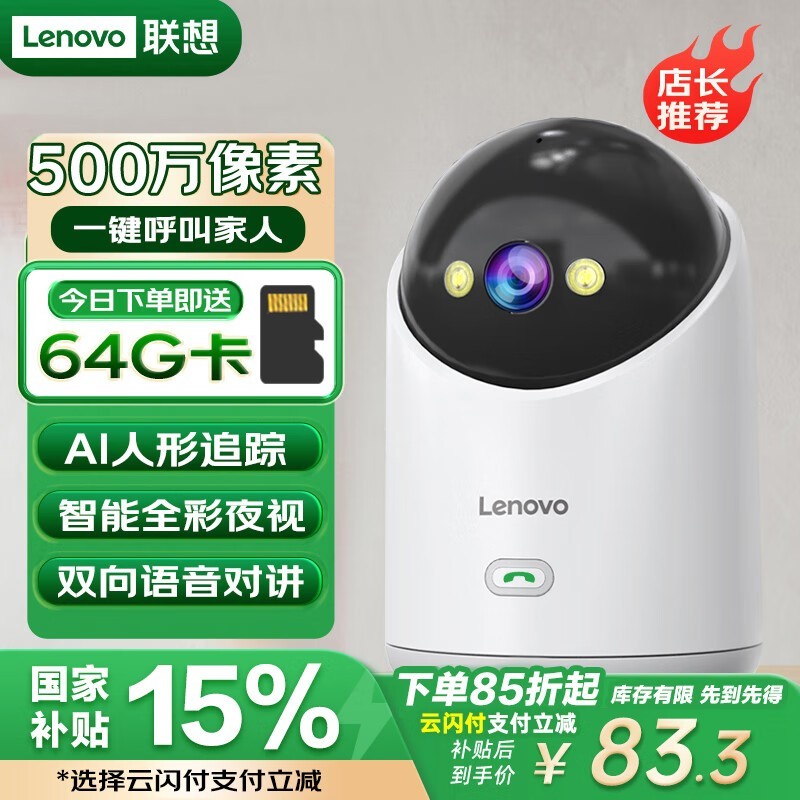 联想家用监控摄像头98元特惠,补贴后仅需83.3元