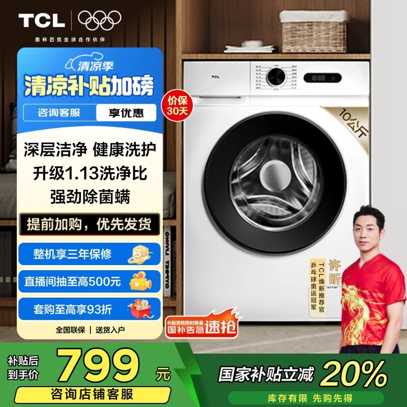 TCL 10公斤除菌变频滚筒洗衣机L110PRO限时特惠780元