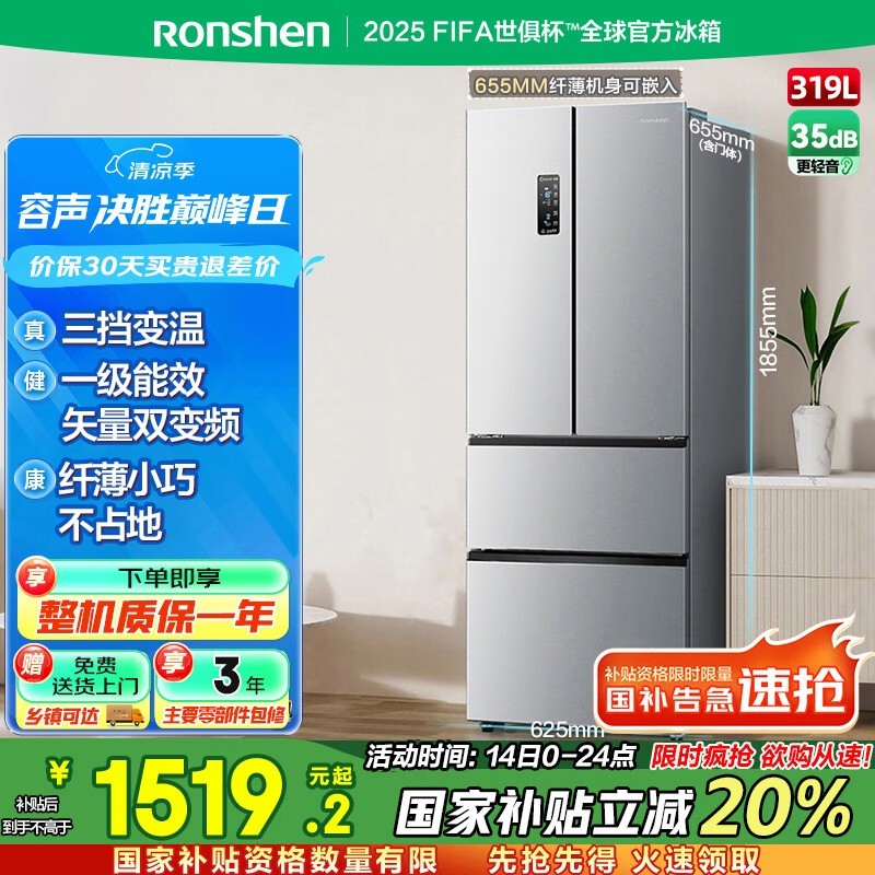 容声319L风冷多门冰箱 京东活动价低至1367元