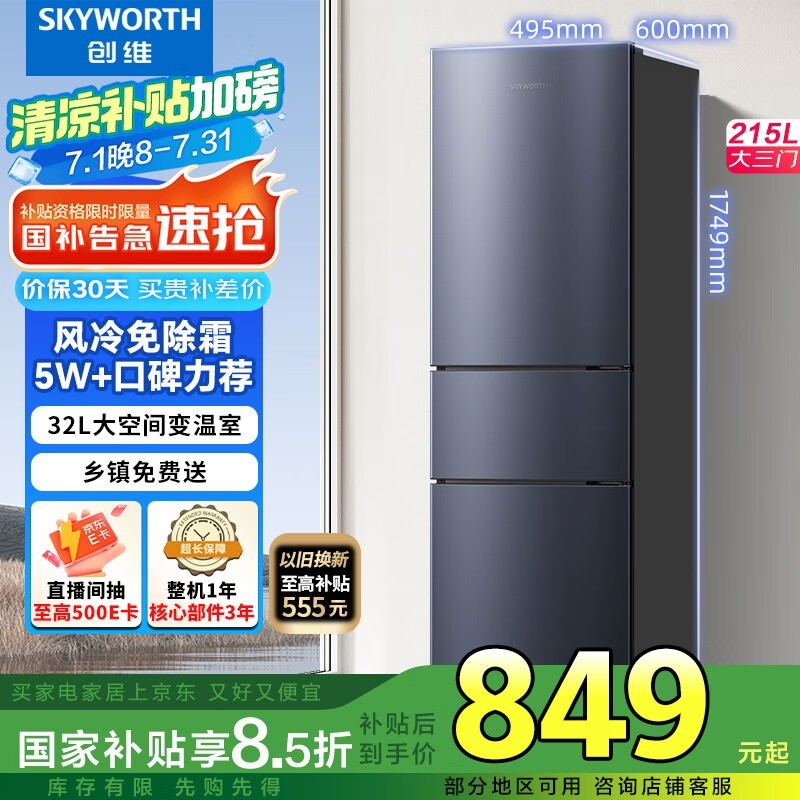 创维215升三门风冷小冰箱京东仅需848元
