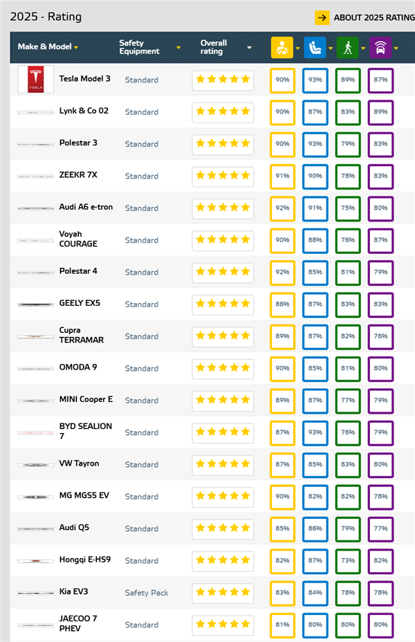 具体来看,特斯拉Model 3虽然已发布多年,但在E-NCAP综合得分榜单上,Model 3仍占据2025年测评车型第一的位置。