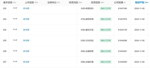 去年11月,永辉超市曾提交多枚“胖永辉”商标申请,国际分类涉及日化用品、啤酒饮料、皮革皮具等,天眼查App显示,目前商标状态均为“商标已注册”。