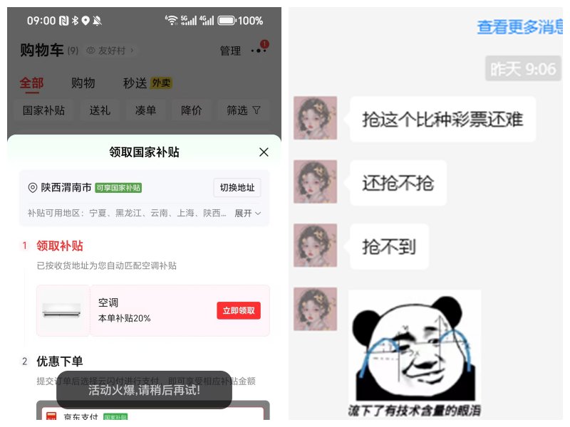 进入下半年,全国家电以旧换新补贴活动继续如火如荼的展开,但近日,消费者抢券难的问题却逐渐凸显,相关抱怨声此起彼伏。陕西渭南的王女士连续多天在电商平台抢购空调和热水器的“国补”券,却始终未能成功。“9:00-23:00为抢券时间,我8:59就开始‘点’了,但每次一到9点就显示‘活动火爆’,多点几下就提示‘今日资格已领完’”,王女士无奈调侃,抢补贴券的难度堪比“中彩票”。类似的情况在湖南、四川、湖北、江苏、吉林等多地均有出现,如湖南长沙某线下家电经销商反馈“店里五六个客户抢,只有一客户抢了一台”。部分热门品类如大尺寸智能电视、高能效冰箱甚至“秒光”,让许多有真实需求的消费者措手不及。