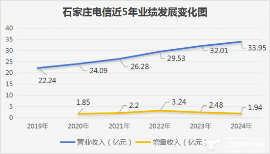 根据下图,石家庄电信在2019年实现营收为22.24亿元,此后每年都在递增,在2024年实现了接近34亿元的营收规模。