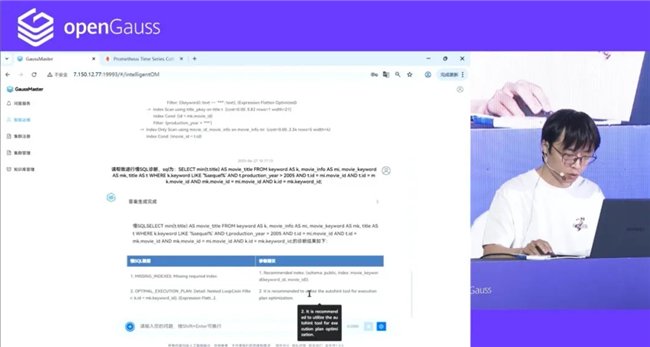 2012实验室研发专家王天元进行了 GaussMaster 智能运维相关的技术演示,在第一个慢 SQL 场景中,GaussMaster 实现了从发现、诊断到优化的全流程慢 SQL 调优能力,显著提升慢 SQL 性能。