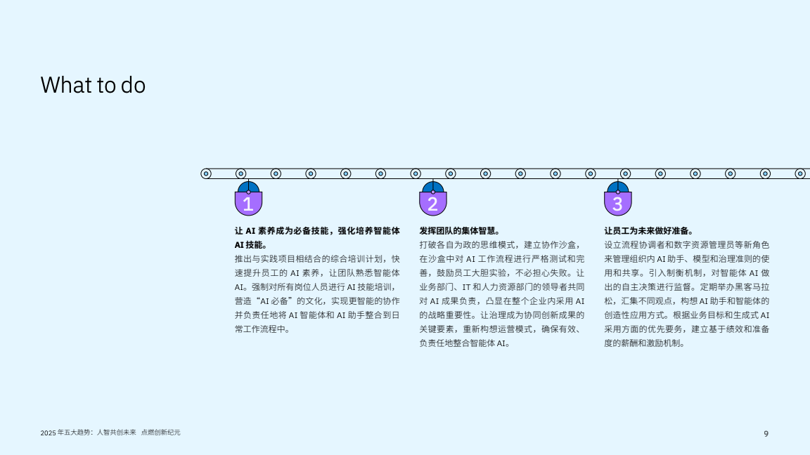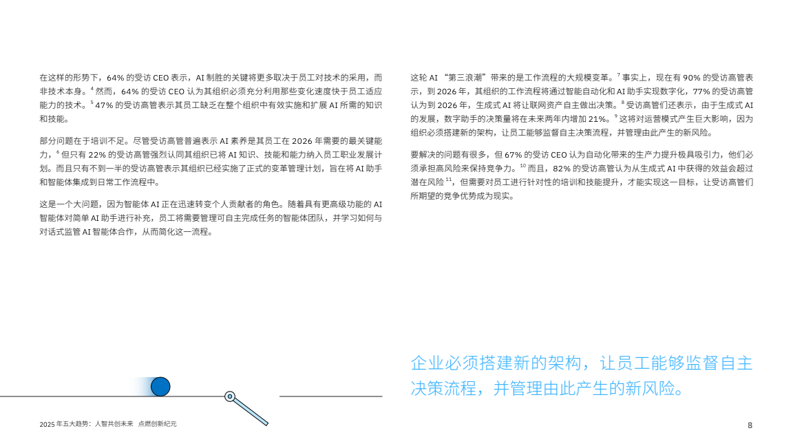 事实上,领导者没有时间审查每一项创新。随着智能体AI 在组织中发挥的作用不断增强,领导者需要下放更多决策权,才能真正加快步伐。他们仍然需要制定目标并明确前进规则,但必须赋权团队重新思考工作流程,并用新的方式部署AI 智能体,从而大幅度提高绩效。