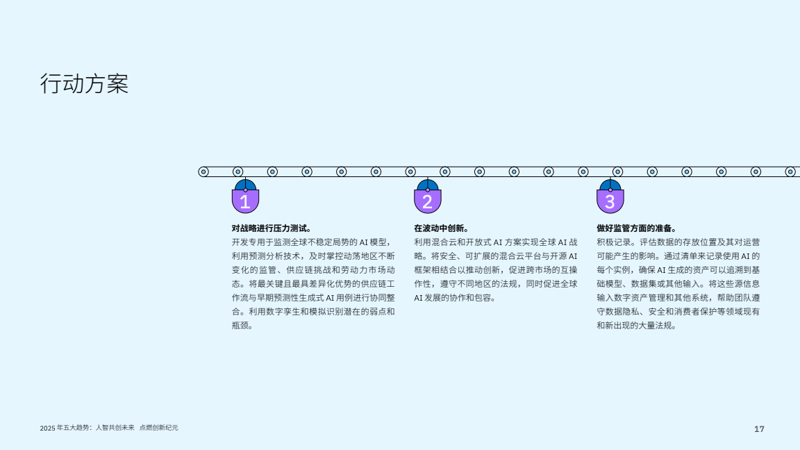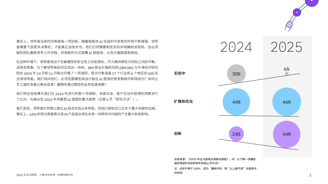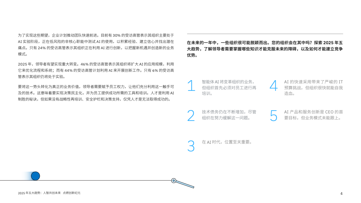 这绝非易事。为了解领导者如何实现这一目标,IBM 商业价值研究院(IBM IBV)与牛津经济研究院在2024年10月和11月联合开展了一项调研,受访对象涵盖17个行业和6个地区的400名全球领导者。我们询问他们,必须克服哪些挑战才能在AI塑造的竞争格局中取得成功?如何让员工做好准备以推动变革?最期待通过哪些机会来加速进展?