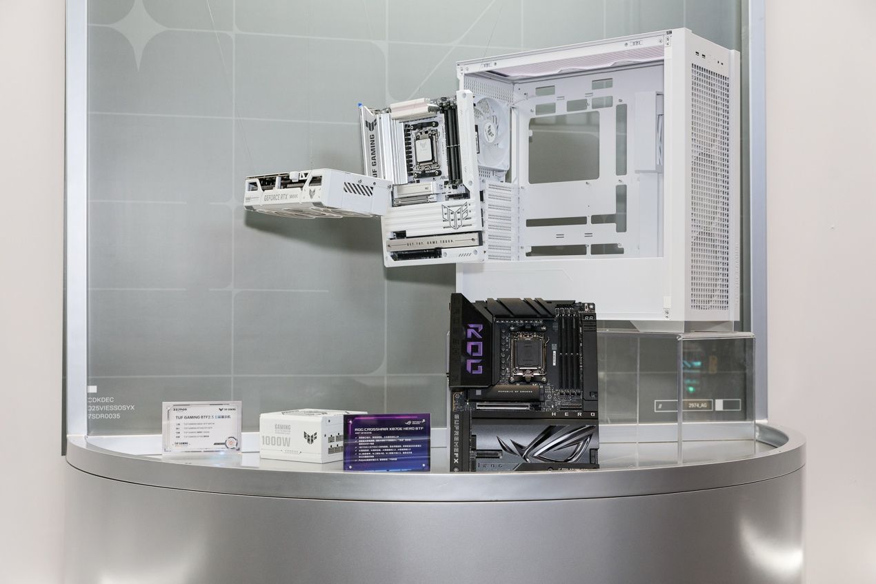 一旁还有TUF GAMING B850-BTF WIFI W背置主板,同样拥有背置接口设计和背置显卡供电插槽,隐藏和减少正面线材,提供更简洁、更高效的装机体验。主板拥有近乎全覆盖的银白散热装甲,连PCB也变为浅色,颜值达到新高度。高规格供电设计和全方位的散热解决方案,可尽情释放锐龙9000系列处理器的潜力。板载3个M.2接口,其中1个支持PCIe 5.0。拥有丰富的USB接口,包括USB 20Gbps Type-C接口以及前置USB Type-C接口,可同时外接多个设备。板载2.5G有线网卡,支持WiFi7,大幅提高网络传输速度。M.2快拆装甲、M.2便捷卡扣、以及易拆式天线都具备,贴心设计让你尽享DIY乐趣。
