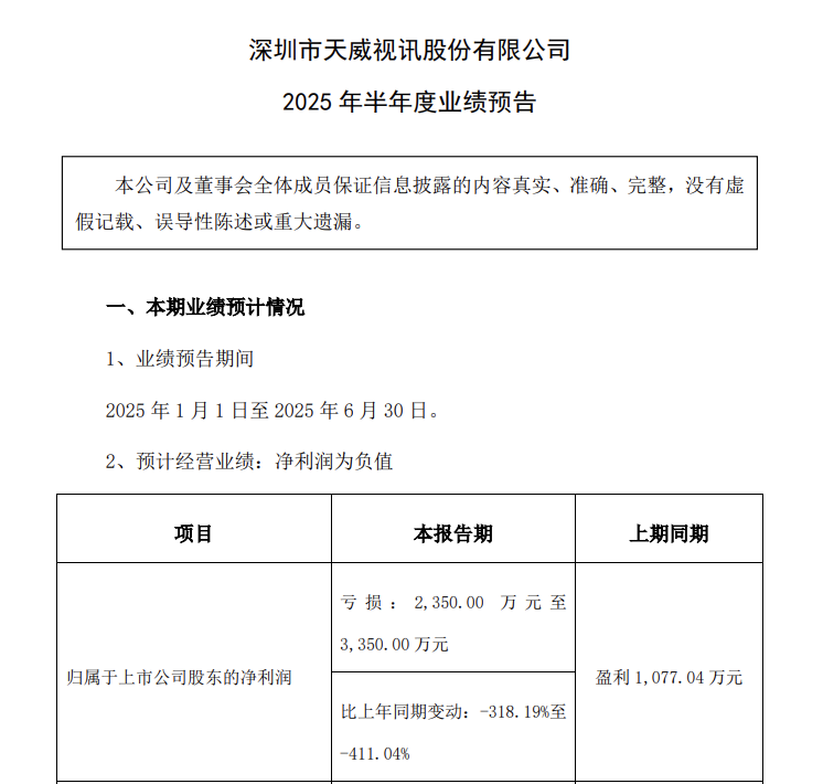 天威视讯预计2025年上半年归属于上市公司股东的净利润为亏损2,350万元至3,350万元,而去年同期为盈利1,077.04万元。扣除非经常性损益后的净利润为亏损3,655万元至4,725万元,而去年同期为亏损702.61万元。主要原因是基础业务收入减少及楼宇覆盖项目减少。