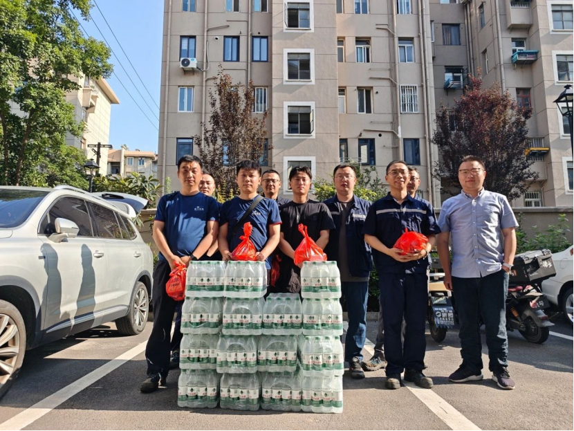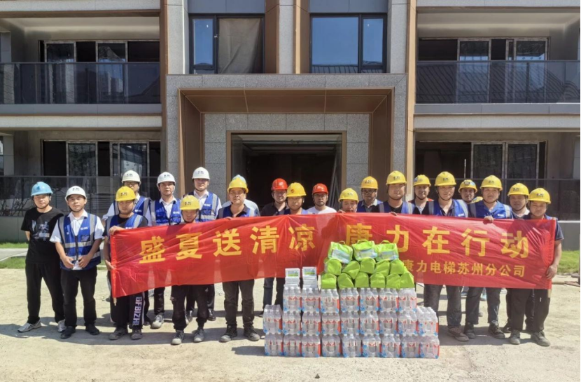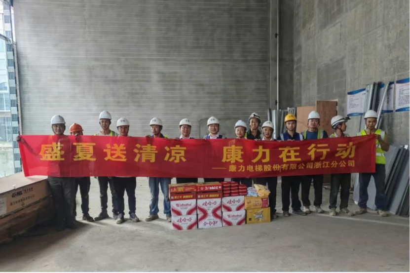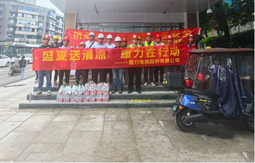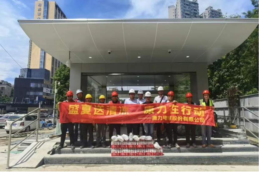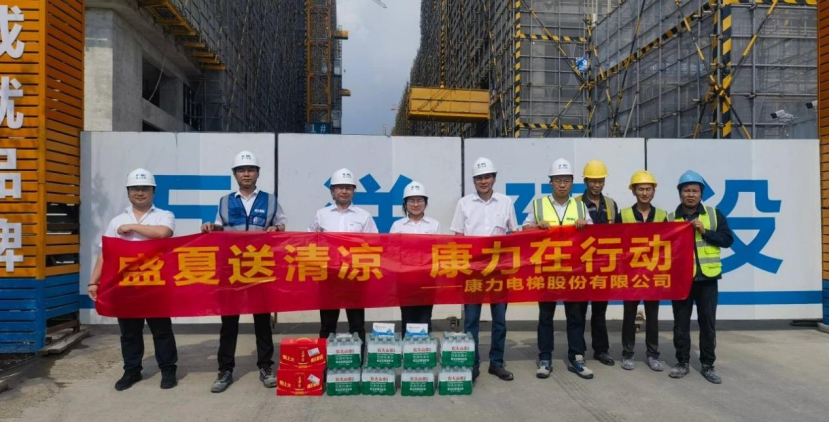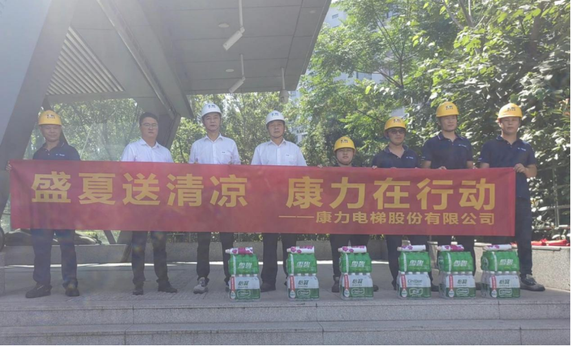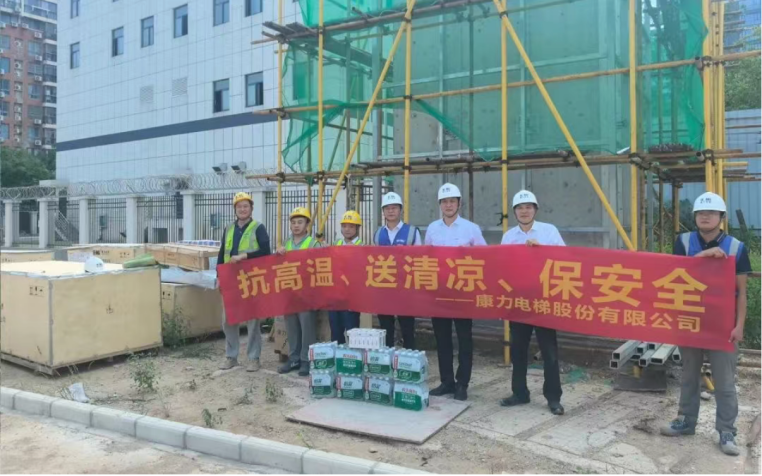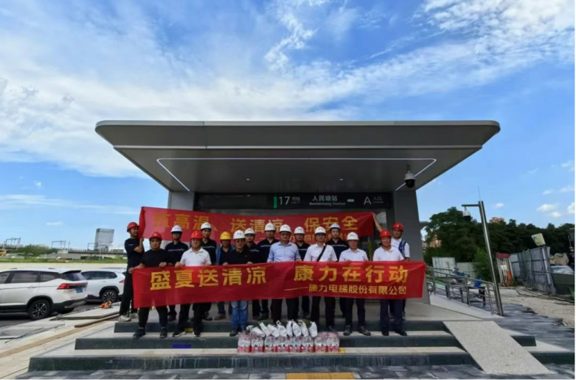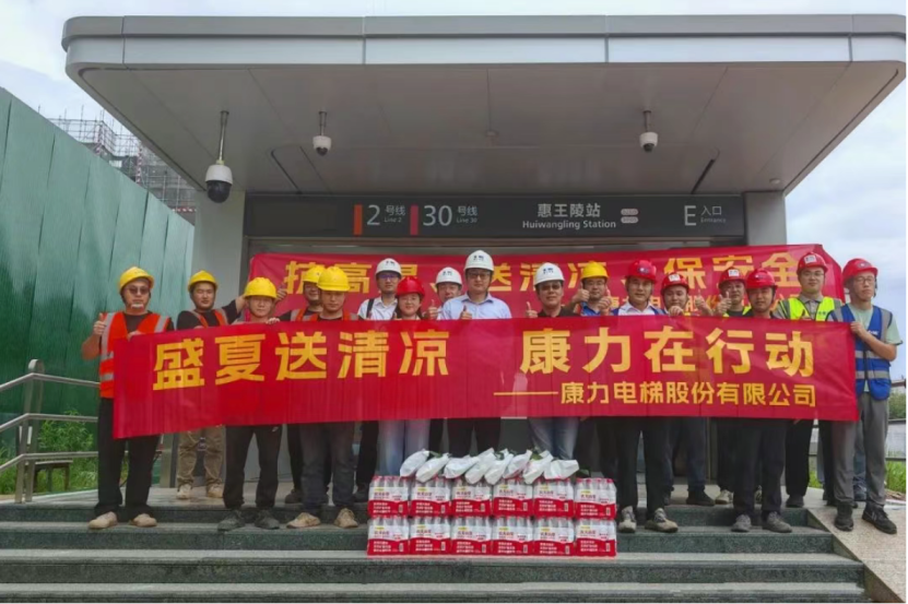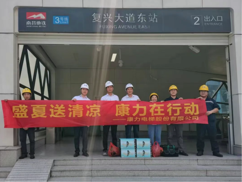 康力电梯前线运营中心副总经理、工程总部常务副总经理王东升,工程总部-安装与支持部部长、轨交管理部部长任建华,代表公司为常州地铁2号线康力电梯服务团队送清凉。