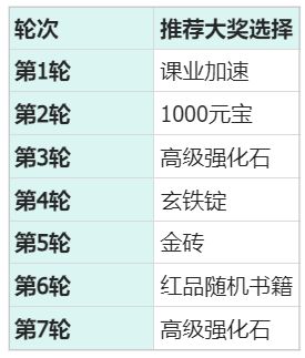 由于课业加速获取途径较少,元宝可通过日常慢慢积累,因此建议前几轮大奖按以下方案选择: