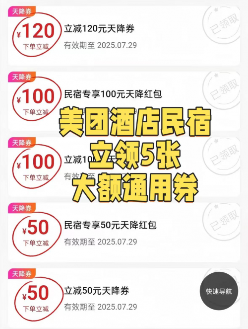 • 美团APP内领取:打开美团APP,首页轮播图常展示酒店优惠券活动,如旅游旺季可能出现“酒店狂欢节”,点击轮播图可进入活动页面领取。此外,特定时段打开APP可能会弹出酒店优惠券弹窗,点击即可领取。也可进入酒店频道,页面上方通常有“领券中心”入口,点击进入能看到各类优惠券,新用户可领较高额度的“新用户专享券”,老用户可领取不同场景的满减券。