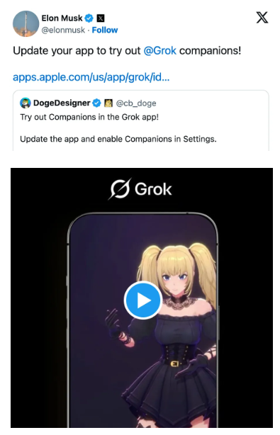 Grok首批上线的虚拟伙伴包括动漫角色Ani和卡通熊猫Rudy。Ani还设有“NSFW模式”,该模式下角色将身着内衣,更符合二次元玩家的喜好,在AI行业中遥遥领先。