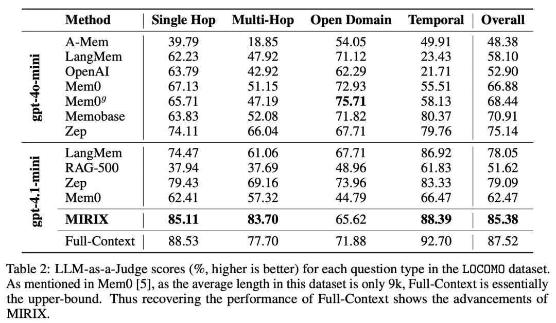 在 LOCOMO 多轮对话推理任务中,综合准确率达到 85.4%,远超一众现有模型,包括 MemOS,Mem0 等;在多跳问题胜过所有开源基线。综合性能几乎接近全上下文模型(由于 gpt-4.1-mini 的上下文窗口为 1M,它的 LOCOMO 性能几乎是上限)。