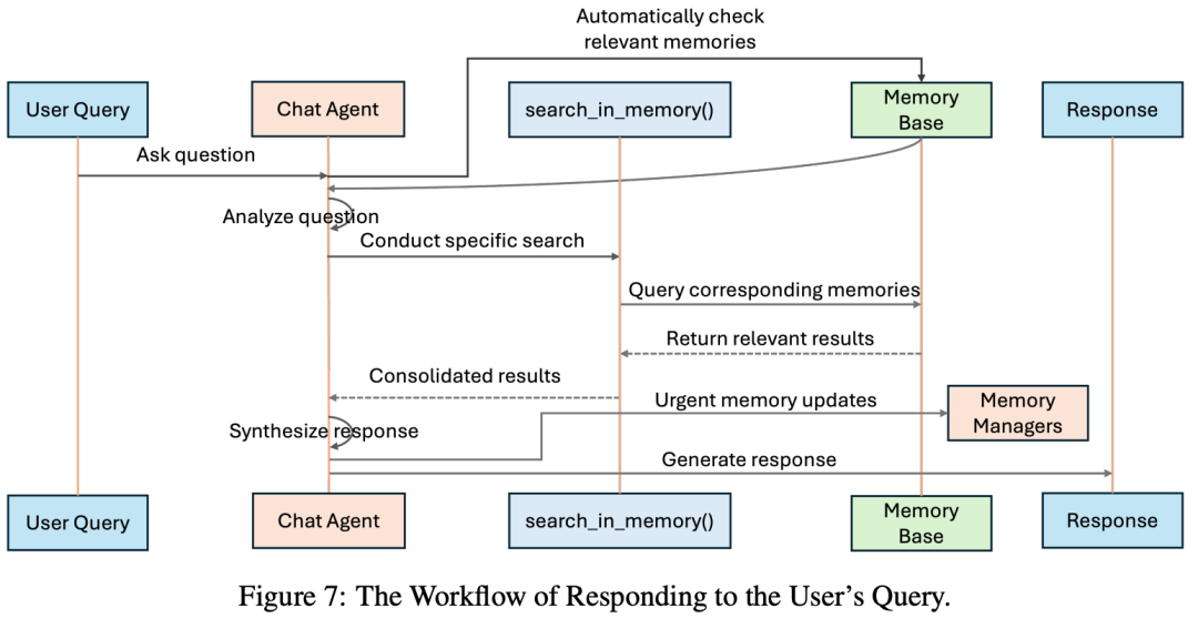 交互式更新:如果用户的查询涉及记忆修改(如添加新信息或纠正历史记录),对话智能体会即时与对应的记忆管理器进行交互,完成更新操作。