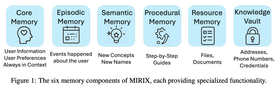 MIRIX 拥有六类核心记忆,能够细分认知角色: