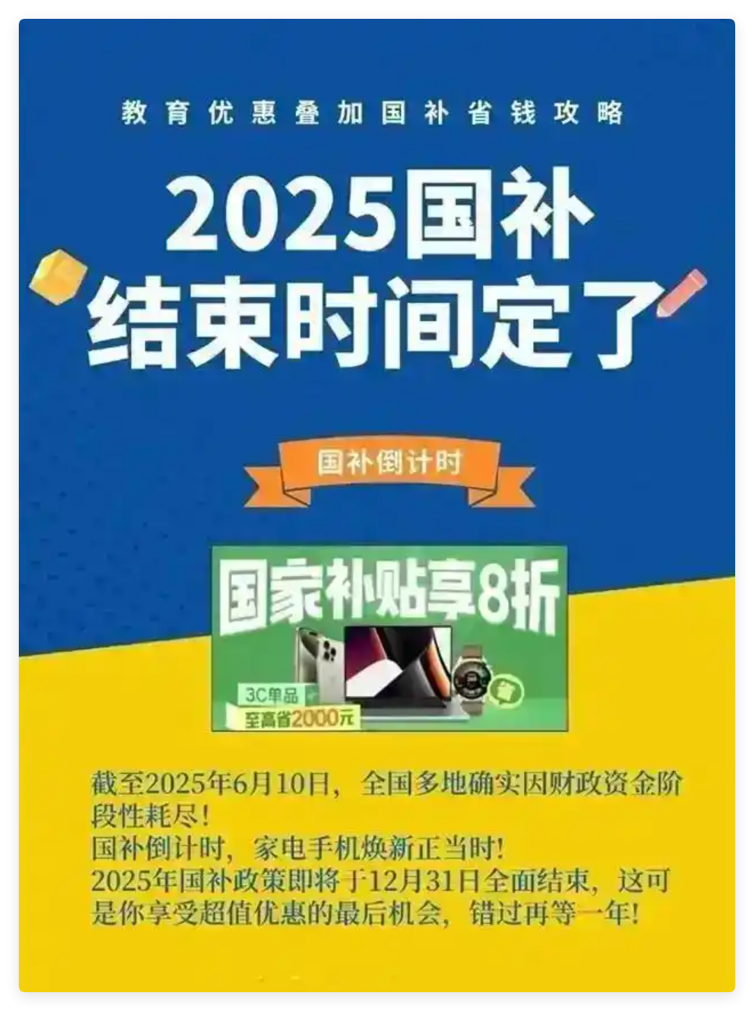 --- 一、6月暂停真相:三大原因引发紧急刹车 1. 钱被“抢空”: 全国3000亿补贴池5个月烧掉2100亿,消耗率超70%!重庆12亿家电额度6月初“秒光”,江苏每日670万额度需卡点“10点抢券”,山东500万额度“1分钟消失”。 2. 重拳打黑产: 无锡团伙伪造300台空调回收单,狂薅60万补贴;广东拦截30万笔异常订单,风控系统紧急升级“身份证+旧机SN码”双重验证,严打职业套利。 3. 防价格崩盘: 618大促叠加国补,部分空调从8000元暴跌至5000元以下,厂商急呼“暂停回血”。 --- 二、7月重启风暴:1380亿砸向这些领域 地方重启时间表: - 重庆:7月1日零点已开闸,新增饮水机、智能马桶等6类新品。 - 江苏:每日10点准时放券,严控跨省套利。 - 广东:线下“粤焕新”持续开放,叠加地方消费券综合省30%。 - 湖北:6月中旬抢先扩容空气净化器、智能手环。 补贴力度加码,省钱公式速存: | 品类 | 补贴规则 | 立省上限 | 实操案例 | |------------|-----------------------------------|----------|------------------------| | 家电家居 | 一级能效补20%,二级补15% | 2000元 | 1万元冰箱→实付8000元 | | 手机数码 | ≤6000元补15% | 500元 | 4000元手机→实付3400元 | | 新能源汽车 | 报废旧车换新能源车 | 2万元 | 报废国四车+换购立减2万 | 隐藏福利:6000元以上旗舰机(如iPhone 16)虽无基础补贴,但京东搜“手机599”可叠加平台折扣。 ---