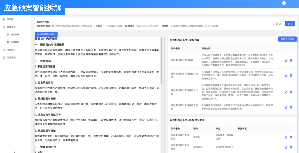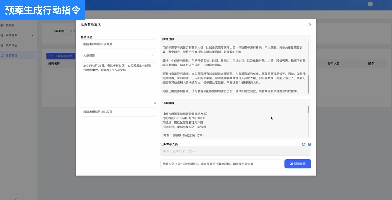 利用大模型能力,快速将电子预案文件拆解成权责指令,并据此智能生成精准行动方案,高效调配资源、执行多渠道通知及实时追踪,显著提升应急响应效率。
