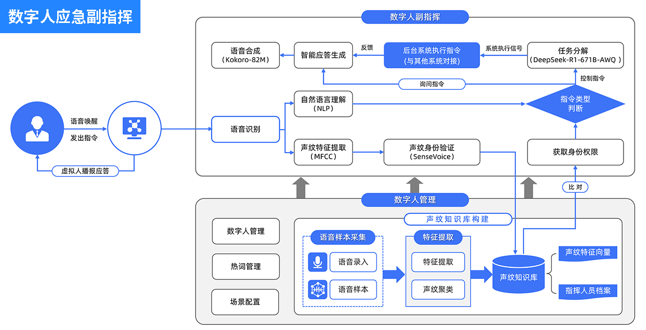 集成语音交互、声纹验证、NLP指令解析及多系统协同功能,在应急指挥中实现实时语音转写、指令下达与任务追踪。