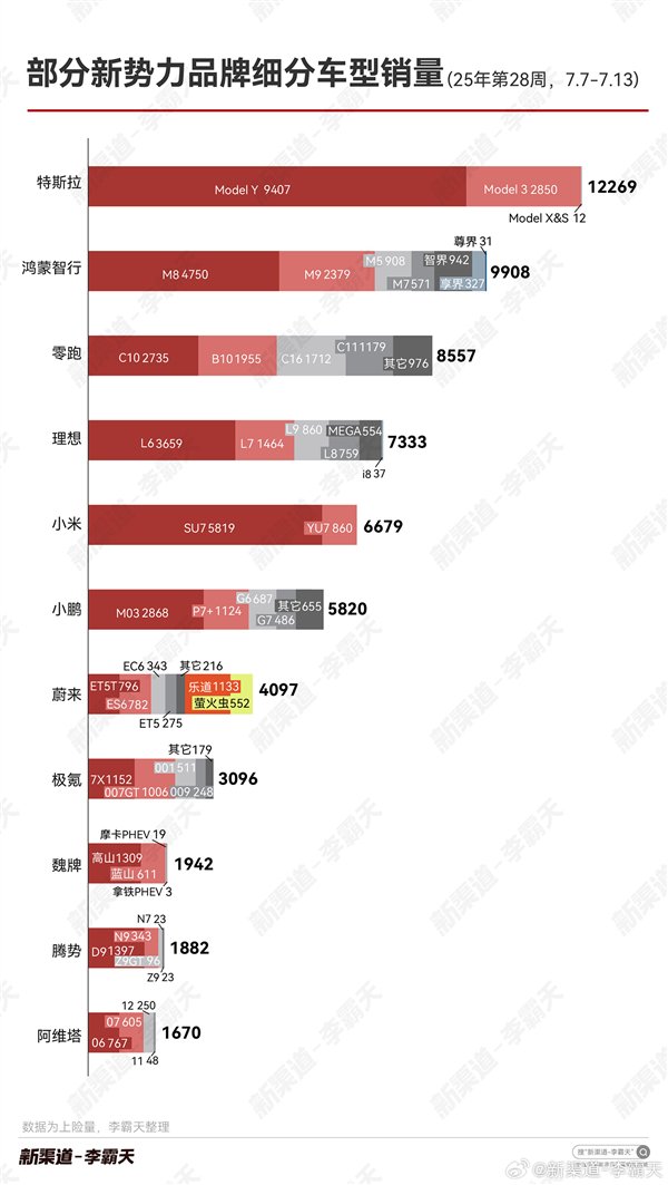 理想汽车单周0.73万辆重回前三,本月全新纯电SUV i8将上市,期待它有不错的市场表现。