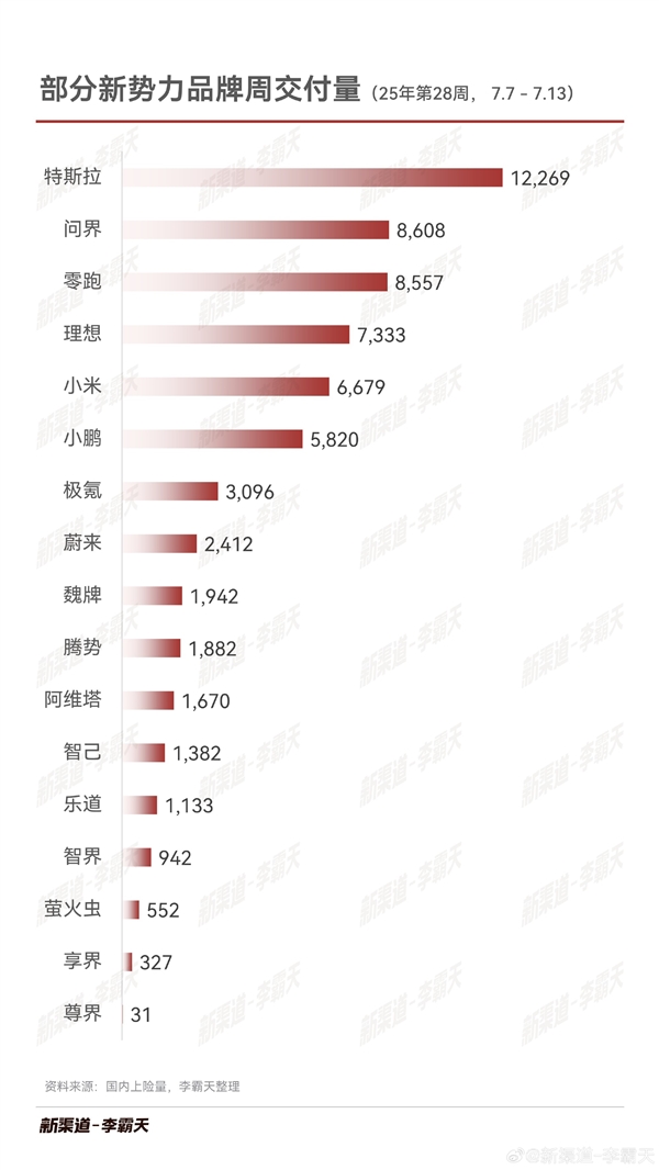 快科技7月15日消息,在2025年第28周,新势力品牌销量榜出炉,其中鸿蒙智行以0.99万辆的销量位列第一。