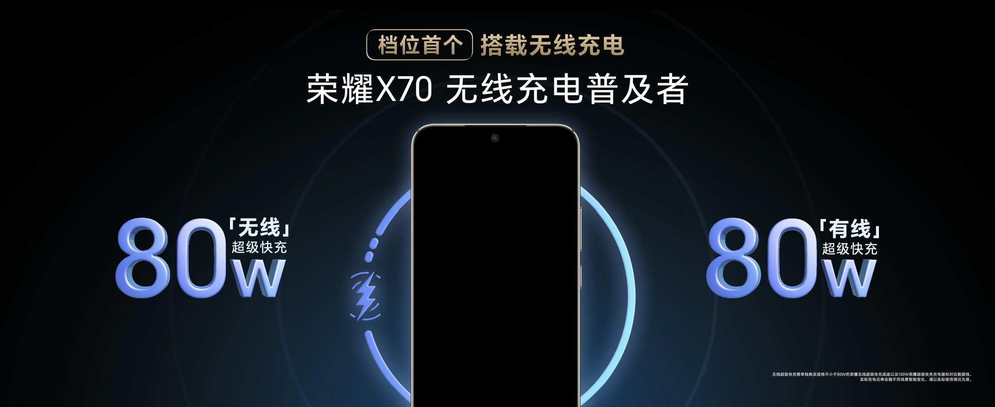 快充方面,荣耀X70 配备80W无线超级快充和80W有线超级快充,用户充电15分钟,可进行通话13小时,抖音刷视频8小时。