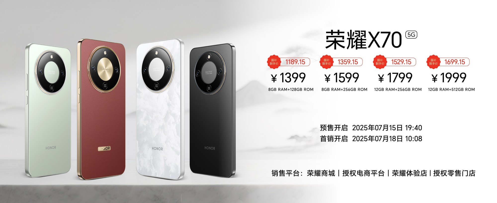 目前,荣耀X70已开启预售,7月18日正式开售,共有四种配色可选,国补价仅1189.15元起,在同档产品中可谓配置最全、体验最强,是当之无愧的“档位最超值”选择。感兴趣的用户可以前往荣耀商城几个大电商平台预约购买。
