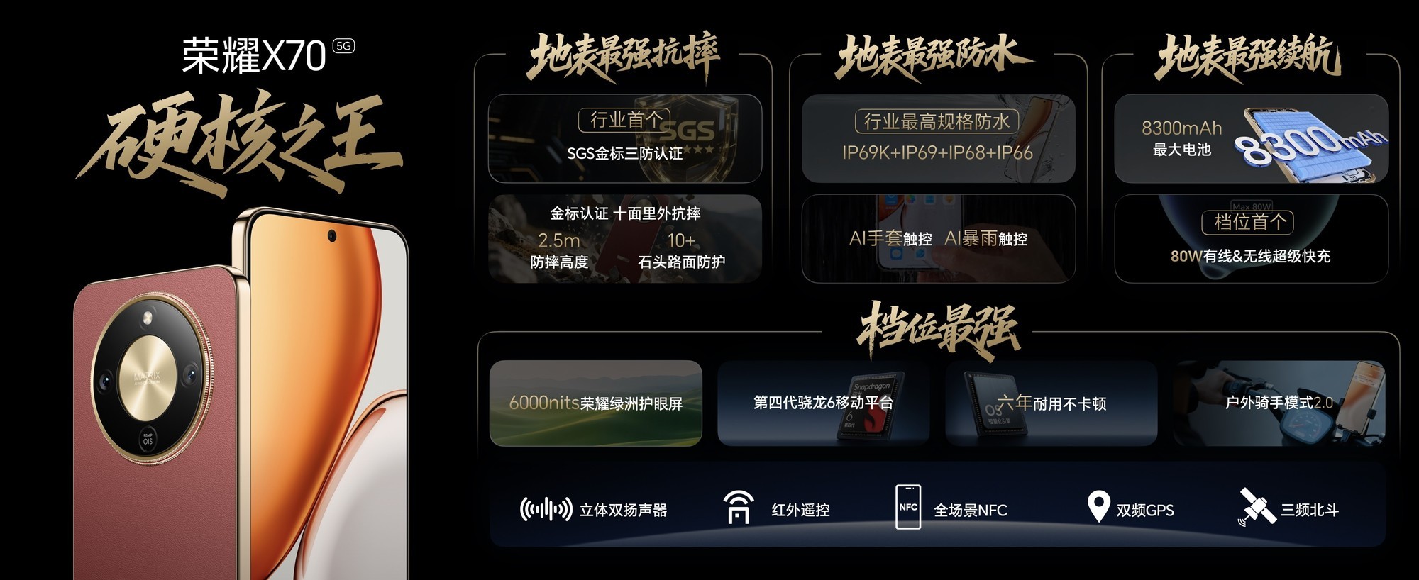 千元机为什么不能有旗舰配置?荣耀X70通过行业首创防弹衣架构、IP69K工业级防水与8300mAh第三代青海湖电池等核心能力,以及诸多越级体验下放,将“科技普惠、品质为先”落到实处,树立国民手机耐用新标杆。