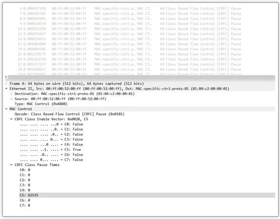 • 接收端可以发送一个新的PFC Pause Frame,将对应优先级的Pause Time设置为0。这就是“恢复(Resume)”信号;