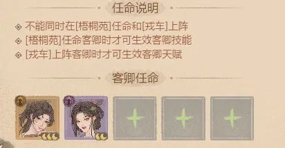 戎车客卿分为紫、橙、红三类品级,品级越高对战力提升越显著。每辆戎车仅可上阵一名客卿,一旦上阵便无法再在梧桐苑中任命并提供属性加成。因此,建议专注于培养一支主力队伍的玩家(如微氪或中氪)只上阵一名客卿,其余均留在梧桐苑中进行任命,以此实现戎车战力的最大化。