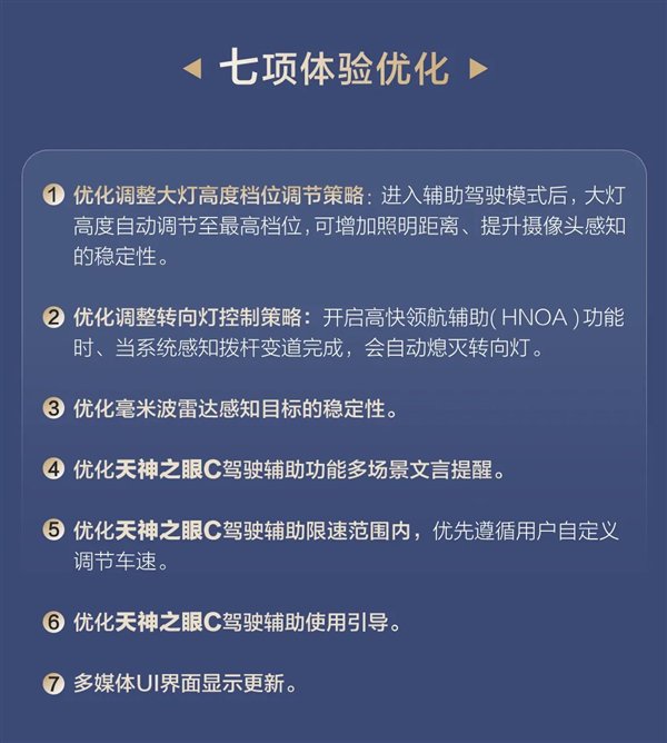 此次升级还优化了大灯高度调节、转向灯控制等七项体验,进一步提升系统稳定性与交互友好度。