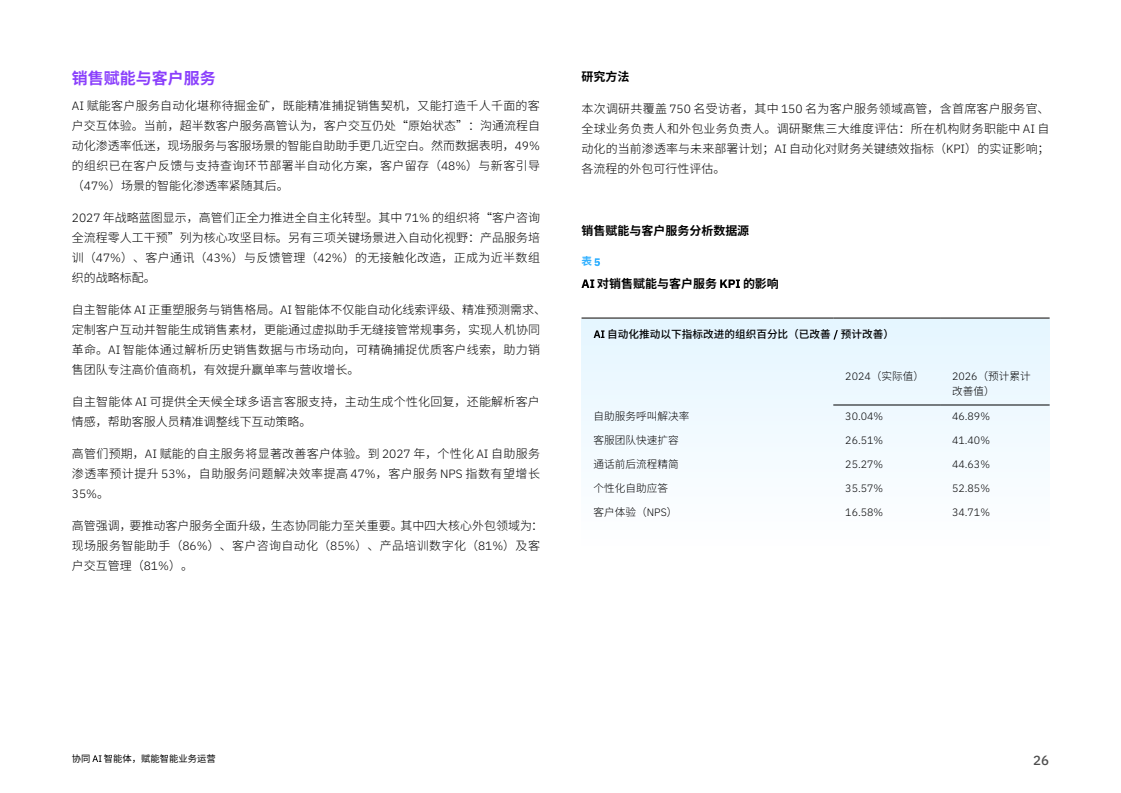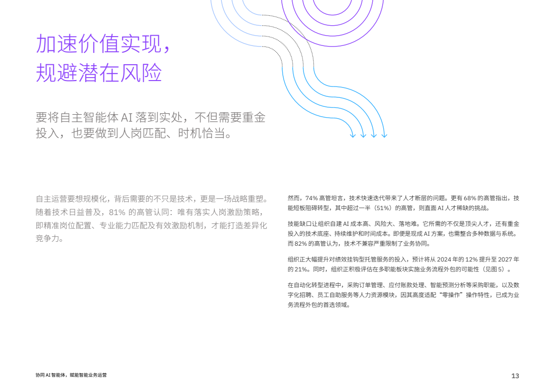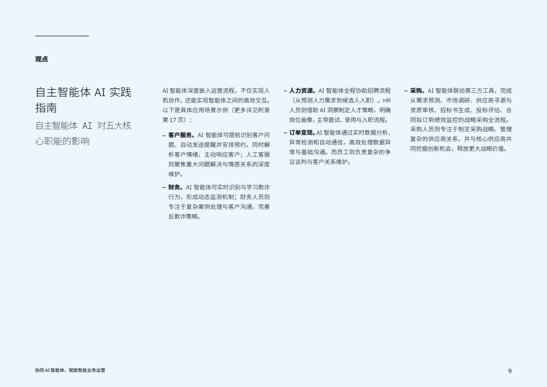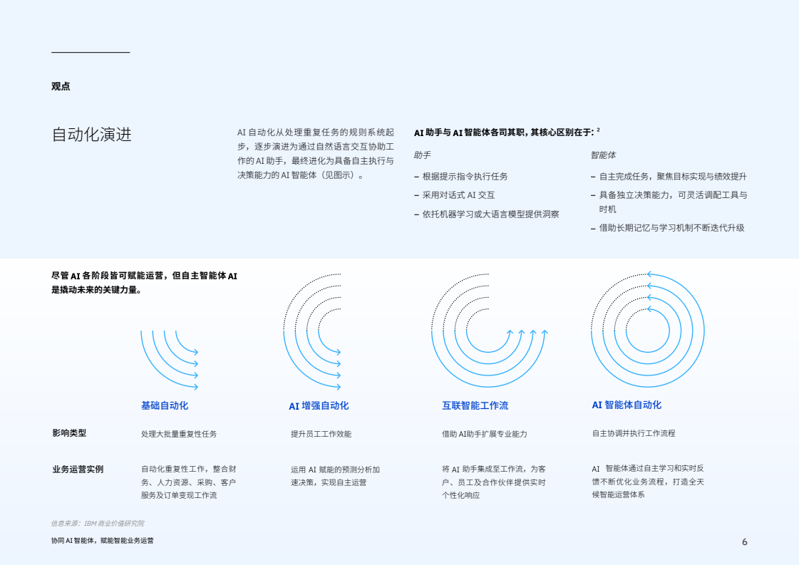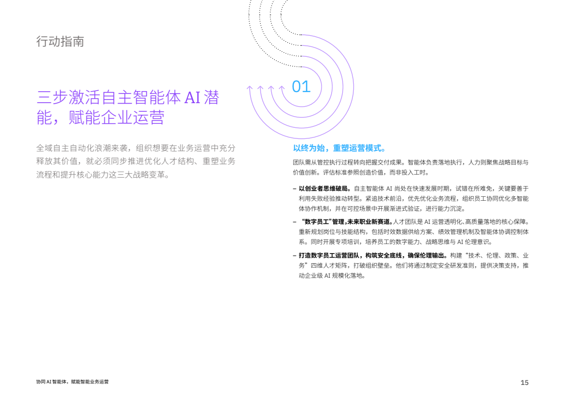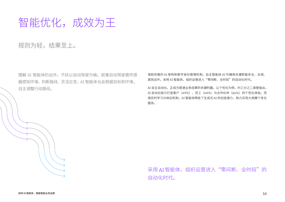 本报告中,我们将深入探讨自主自动化的三个关键要素。第一部分,阐述了一种人机协作新范式:技术执行操作,人类主导协同。第二部分,揭示了智能体价值逻辑:聚焦成效导向,突破规则限制,人类全程赋能增效。第三部分,探讨了全球化部署策略:战略专家协助规避风险,实现规模化落地。报告最后,提供了一份切实可行的行动指南,助您把握自主自动化战略机遇。