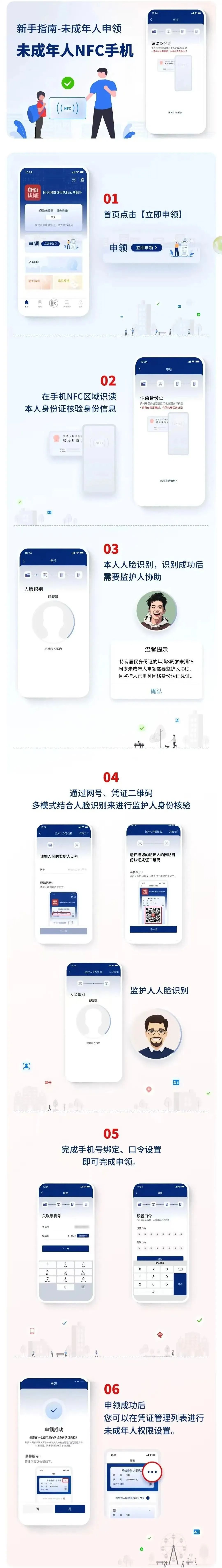 如果是成年人申领的话,首先需要一部支持NFC功能的手机,在应用商店搜索并下载“国家网络身份认证App”。之后,在App首页点击立即申请,选择证件类型,在手机NFC区域识读本人身份证核验身份信息后,进行本人人脸识别,设置关联手机号码和网络身份认证凭证口令,申领成功后,就可以选择在当前手机使用网络身份认证凭证了。