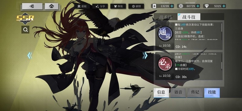 支援技能,等级10,每18秒召唤5架轰炸机,造成最高2625%(轰炸+航空)的航空伤害;队伍中白鹬每秒恢复2%生命值,持续8秒,夜间战斗无法使用。
