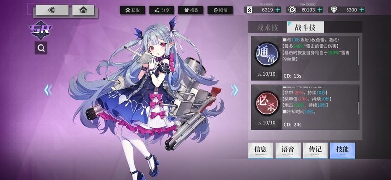 普通技能,10级时每13秒发射一枚鱼雷,造成最高540%雷击伤害;暴击时恢复自身150%雷击值的血量。