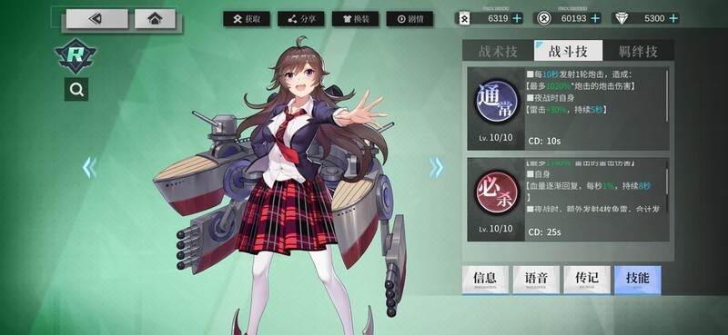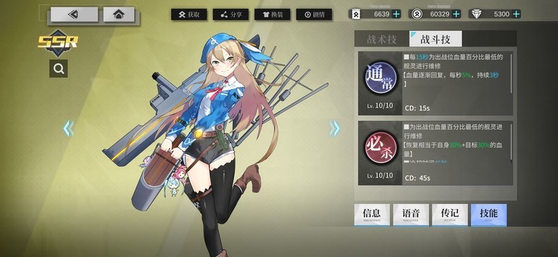 必杀技Lv.10:为当前血量百分比最低的出战舰灵进行维修,恢复自身30%加上目标30%的生命值,冷却时间为45秒。