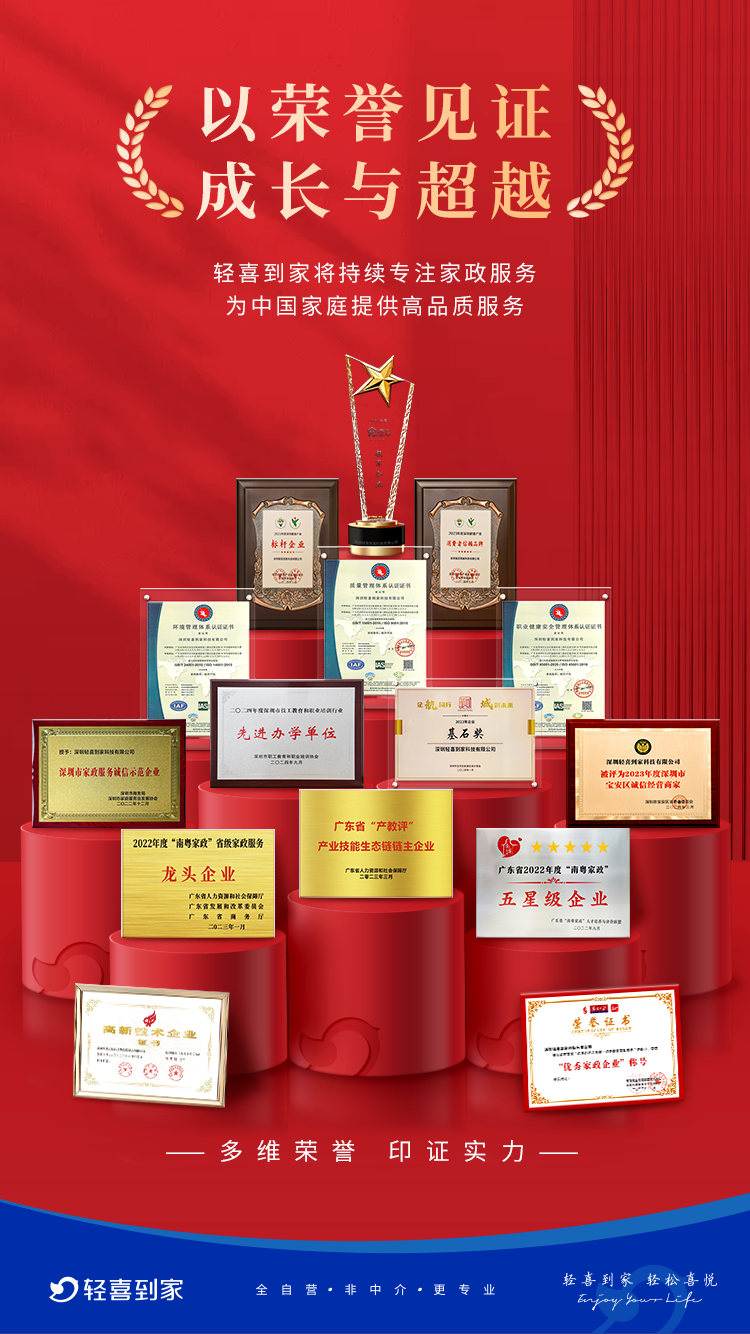 “十年间,轻喜到家拓城68座,服务次数近8千万次,从初创品牌迅速成长为国家高新技术企业、深圳行业领袖企业100强、“南粤家政”省级家政服务龙头企业以及广东省产教评产业生态链首批链主企业,实现从育婴早教到养老护理的全品类口碑覆盖,带动家政消费的持续升温。”轻喜到家负责人自信道。