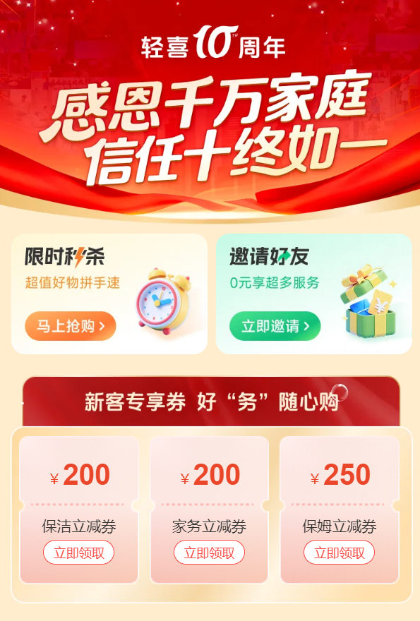在本次十周年庆典版活动中,用户可享高端深度保洁/家务小时工200元立减券,保洁单次低至37元/小时,升级包年3次初体验则可全部免单;轻喜自营保姆0中介费、体验满意再固定,钟点/住家/白班/养老保姆均能灵活预约,实现一对一精准匹配;自营金牌月嫂不单支持免费预约咨询,而且签约最高直降2800元,还送月子餐具,待产包等好礼;家电专场大扫除2人拼团立返现100,由专业工程师携成套工具上门服务,一次搞定积尘细菌。